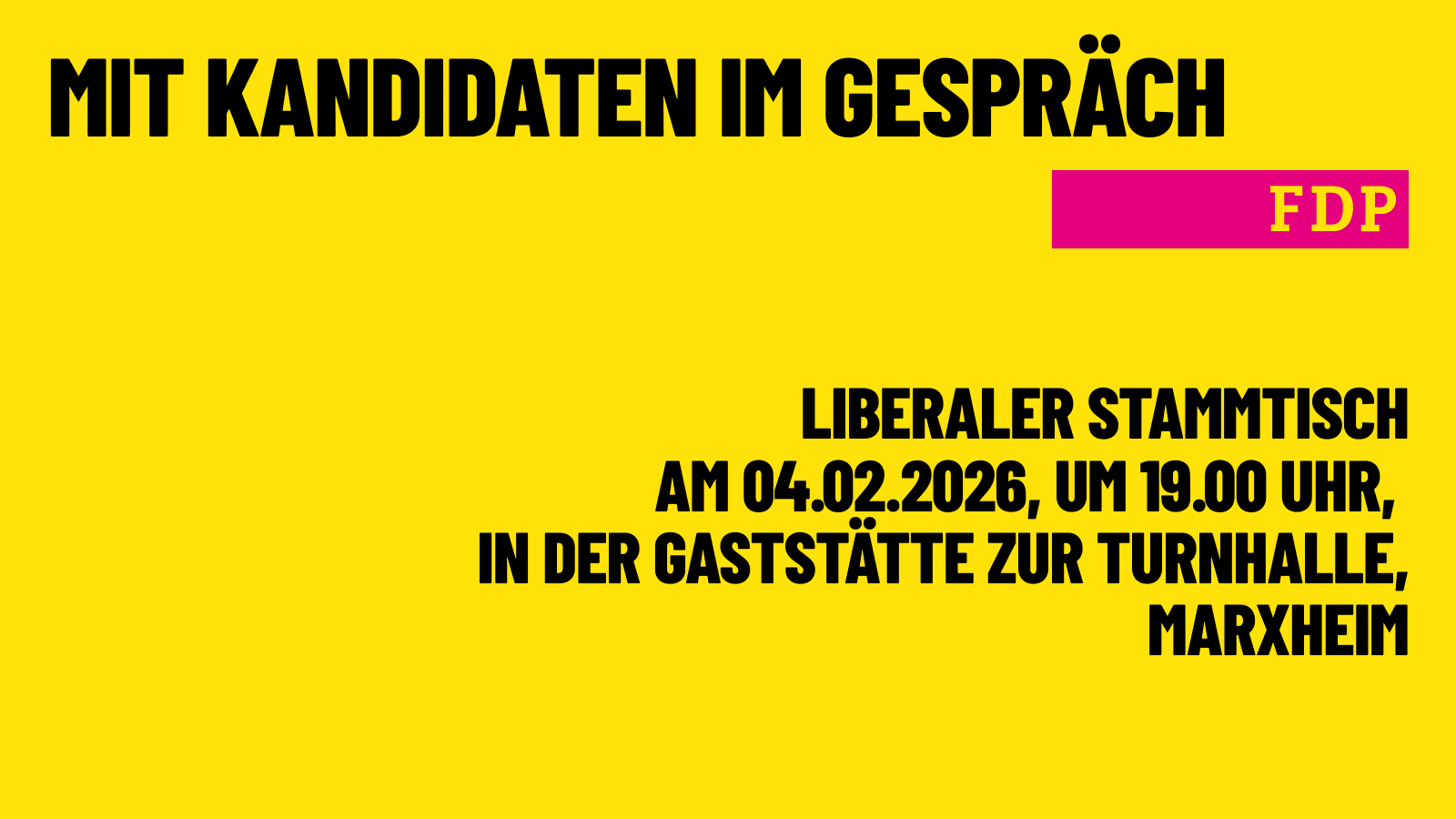 Am 15. März 2026 sind Kommunalwahlen, und alle Hofheimerinnen und Hofheimer sind aufgefordert, ihre Stimmen abzugeben. In Hofheim geht es um die Zusammensetzung der Stadtverordnetenversammlung und der Ortsbeiräte. Die Freien Demokraten haben Listen für die Stadtverordnetenversammlung und für die Ortsbeiräte in der Kernstadt, in Marxheim und in Lorsbach aufgestellt. Gelegenheit, die liberalen Kandidaten kennenzulernen und mit ihnen ins Gespräch zu kommen, bietet der liberale Stammtisch am Mittwoch, den 04. Februar 2026, um 19.00 Uhr, in der Gaststätte Zur Turnhalle in der Kreuzgartenstraße 23 in Hofheim-Marxheim.